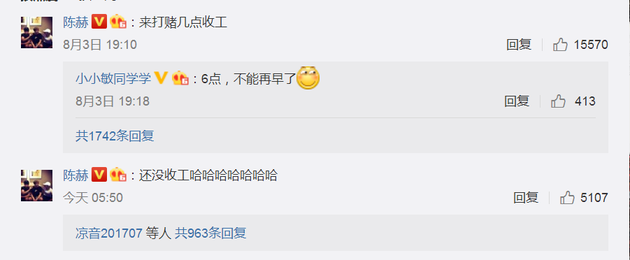 网友见此纷纷留言回复:“6点,不能再早了!”也有网友关心道:“赫哥,工作也要好好休息呀!”“辛苦辛苦,要瘦啦!”陈赫在4日凌晨五点五十评论道:“还没收工哈哈哈哈哈哈哈!”