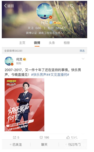 今晚(8月11日)八点,2017《快乐男声》将开启现场直播模式,迎来首场个人抢冠赛。“老搭档”何炅再次回归快男舞台,共同见证今年七强的冠军之争。近日,何炅发微博:“2007-2017,又一件十年了还在坚持的事情。快乐男声,今晚直播见!”网友纷纷点赞:“十年坚守,不忘初心”、“有何炅的快乐男声才是那个记忆中那年夏天的快乐男声。”