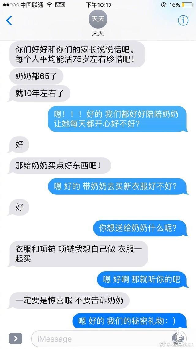 聊天中,天天说:你们好好和你们的家长说说话吧。每个人平均能活75岁左右,珍惜吧!奶奶都65了,就10年左右了。