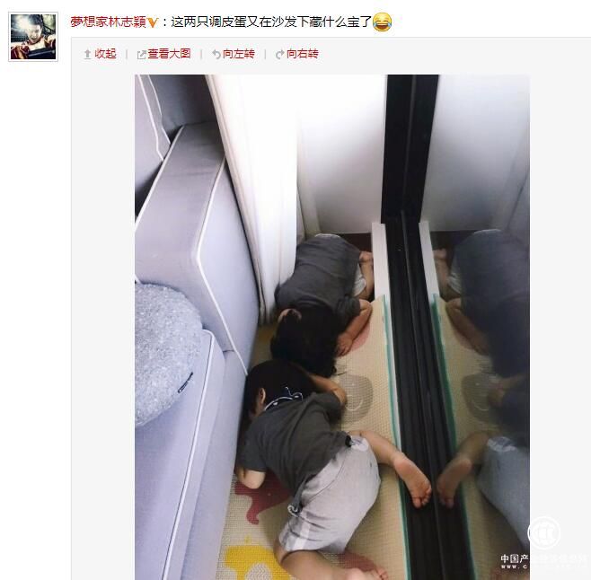 凤凰网娱乐讯 8月29日下午,林志颖通过微博晒双胞胎儿子齐趴在地上“寻找”的照片,并写到:“这两只调皮蛋又在沙发下藏什么宝了?”