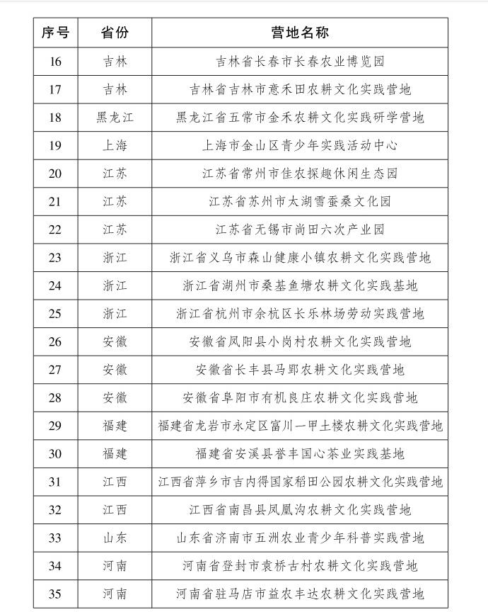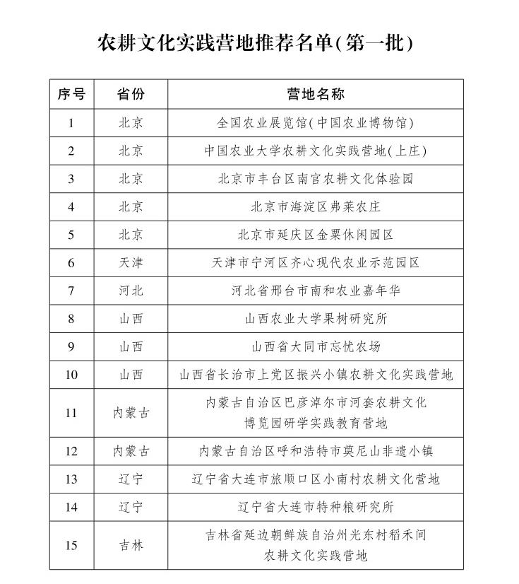 记者从农业农村部官网获悉,农业农村部办公厅、共青团中央办公厅、全国少工委办公室联合公布了首批农耕文化实践营地推荐名单,全国农业展览馆(中国农业博物馆)等60个单位入选其中。