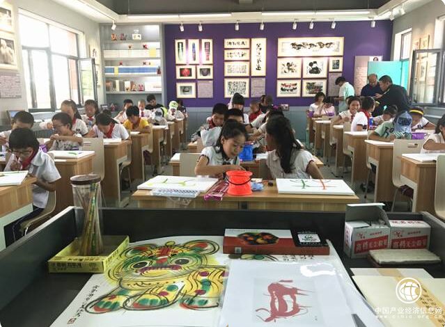 走进“美林教室”,可以看到四周墙面悬挂多幅韩美林的动物水墨画作品、钧瓷作品图片、蓝染布艺作品、岩画刻盘作品。教室还设置了阅览角,配备了专业的中小学生美术绘画书籍。