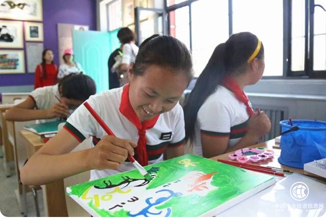 在挂牌之后,“美林教室”举办了第一堂美术课。这堂课以“印迹?岩画”为主题,在银川韩美林艺术馆员工的指导下,同学们用丙烯颜料和画笔,在白色的画板画下了幸福和缤纷的色彩。