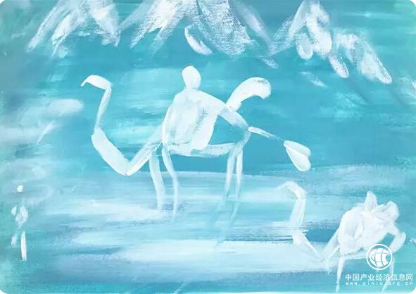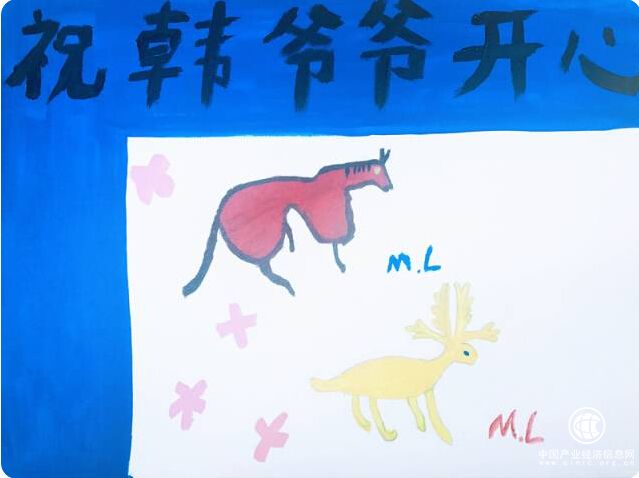 岩画简洁流畅的线条,在孩子们手中幻化成世间万物。他们天马行空却内心细腻,牛、马、羊鲜蹦活跳地出现在他们的笔下。有的还在油画板上认真地写下了“祝韩爷爷身体健康”、“祝韩爷爷开心”的祝福语,有的则像模像样地写下韩爷爷的落款“ML”。