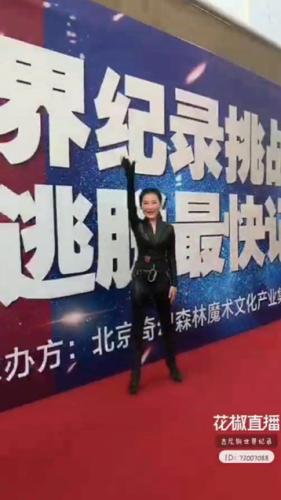 7月22日,山东威海国际海滨浴场,魔女张瑞宁以53.70秒的成绩成功刷新“悬挂于热气球时从约束衣逃脱的最快时间”吉尼斯世界纪录称号。花椒直播受邀全程直播此次吉尼斯世界纪录挑战过程,让广大网友身临其境感受现场的震撼、惊险与刺激!