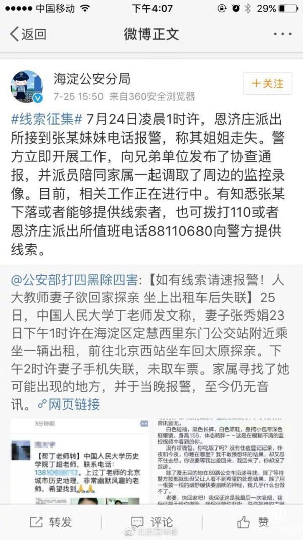 @北京青年报 官方微博7月25日消息,今天(7月25日)上午,中国人民大学历史学院老师丁超在朋友圈发布了一条寻人启事,称自己妻子张秀娟于7月23日(周日)下午1点,本应乘坐89路公交车从北京市海淀区定慧西里去北京西站,但最终未乘公交车,而是乘坐了一辆出租车。从当日下午2时许,家人与张女士失联至今。家属称,张女士在此期间没有回家,也没有坐原计划去太原的火车,手机关机,音讯皆无,家属已于7月23日晚报警。