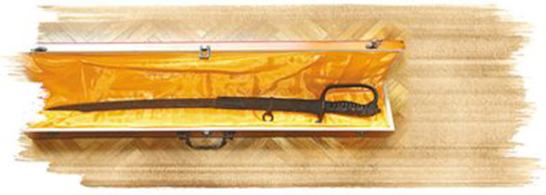 打开像二胡琴盒那样的一只精美的樟木匣子,红布裹着的一柄修长的硬物静静地卧在橙色的绸缎中;再一层层掀开红布,一把两指宽,近一米长的指挥刀,蓦然出现在众人眼前。刀呈弧形,作为刀的部分从由铜条环护的龙头刀柄处伸出,长长的像一条带鱼那样微微翘起来。刀身是黑的,不是人为涂上去的黑,而是被渐渐生长出来的锈覆盖了原有的光芒。换个角度说,那斑斑锈迹,是南方慢慢的,年复一年,日复一日,在刀身和刀刃上凝固的漫长、潮湿而又沉寂的时间。