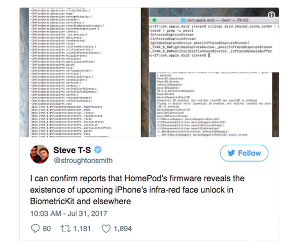 除此之外,固件代码还泄露了iPhone 8正面会使用红外线传感器来拍摄人物脸部,而不是通过传统相机的可视光。