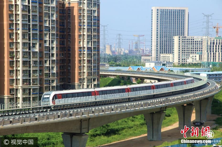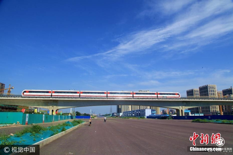 8月5日,北京,磁浮列车在轨测试。北京磁悬浮示范线,又称北京地铁S1线,目前正在轨道测试运行。S1线是北京首条磁悬浮线路,一期工程全长10公里,起点为北京石景山区的苹果园站,终点为门头沟区的石厂站。李长山 摄 图片来源:视觉中国