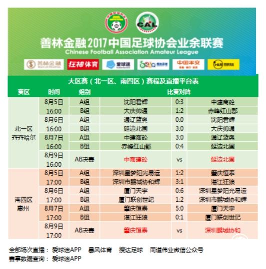 善林金融2017中国足协业余联赛8月7日进行了北一、南四分赛区小组赛最后一天的两场较量,中建商砼、延边北国、肇庆恒泰、厦门联创取得比赛胜利。同时产生了两个赛区将在8月9日进行决赛的队伍,分别是北一区:中建商砼、延边北国;南四区:肇庆恒泰、深圳鹏城。