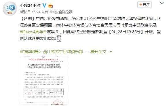 8月8日,据中国足协职业联赛理事会公布,江苏苏宁主场的中超第22轮比赛延期。理由是南京奥体中心在本周末将承办TFBOYS的演唱会,比赛被推迟到了九月底。