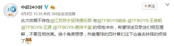 中超第20轮结束后,就开始传出了江苏苏宁下一个主场要延期的风声,因为TFBOYS将于同一个周末在南京奥体中心体育馆举行演唱会。