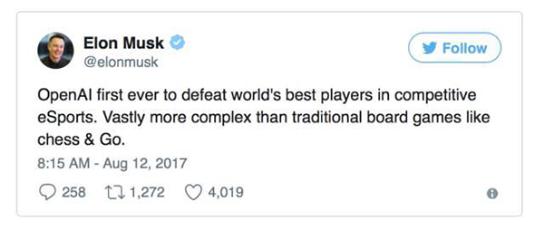 Elon Musk发表推文称赞OpenAI的战绩,并称其为“在电子竞技领域首个击败人类顶级玩家的机器人”。