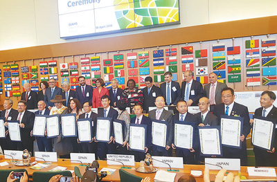 第五届全球重要农业文化遗产国际论坛上获世界重要文化遗产授牌的各国代表合影。本报记者 叶 琦摄