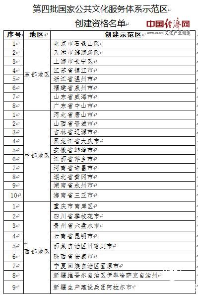记者了解,2017年8月10日,原文化部、财政部印发了《关于开展第四批国家公共文化服务体系示范区(项目)创建工作的通知》,启动了第四批国家公共文化服务体系示范区(项目)创建工作。经过各地申报、专家集中评审、公示等环节,产生了此次第四批国家公共文化服务体系示范区(项目)创建资格名单。