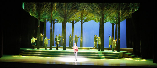 该剧的无场次并非没有场次,而是每场可长可短,可远可近,转换自由,灵活多变。人物则招之即来,挥之即去,故事是有话则长,无话则短,可前后衔接,可时间跳跃,可隔空对话,省去了可有可无的叙述交代,使这出戏的节奏明快,内容紧凑。同时,这样的剧本给目前的舞美大制作也起到了抑制的作用,她不容你有过大过笨的布景来迁换。作为舞台母体的一剧之本对这出戏的风格和走向有了明确的引领方向,导演则要利用这种剧本结构加以二度构思,打造出该剧洗练、明快、灵动的艺术风格。