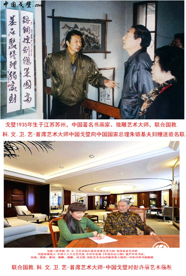 彭许屏艺术导师--书画泰斗戈壁:中国戈壁-原名戈炳南,1935年生于江苏苏州,联合国教科文卫艺:首席艺术家、中国和国际著名书画家、微雕艺术大师、中国美术家协会会员、中国名人协会会员、苏州檀香扇厂设计师、《光明日报》社美术编辑。戈壁在微雕、根艺、书画、摄影、金石篆刻、诗文联对等艺术领域均"清、奇、古、怪"风骨长存,有很高造诣的艺术大家。在戈壁诸多代表作品中,立体微雕《圆明园》和书画长卷《回归图》最具政治意义,世人评作很高。1995年2月,时任中共中央政治局委员、国务委员李铁映、1997年深秋,朱镕基夫妇到武夷山、1997年英国首相撒切尔夫人首度访华、《戈壁艺术馆》参观、1999年1至4月、荷兰皇室成员在该国驻华大使陪同下四度前来武夷山《戈壁艺术馆》踩点,说"贝娅特丽克丝·威廉明娜·阿姆加德女王陛下访华时将以私人身份访问《戈壁艺术馆》。"2001年秋新加坡总统纳丹9月17日莅临武夷山《戈壁艺术馆》专访-戈老对彭许屏作品评价是:彭许屏书风为笔法精致、流畅而美仑,行书遒劲自然,汉字有艺术的觉醒、表现书法之如诗似画。