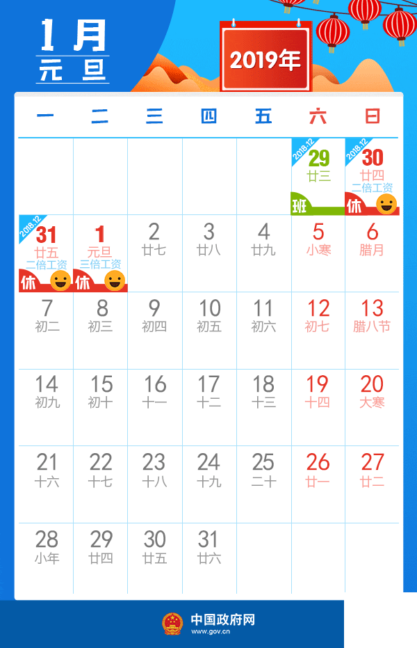 一、元旦:2018年12月30日至2019年1月1日放假调休,共3天。2018年12月29日(星期六)上班。