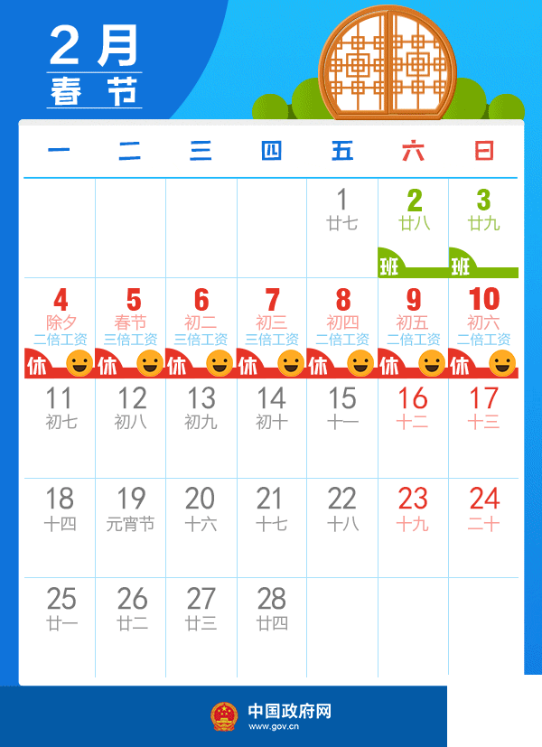 二、春节:2月4日至10日放假调休,共7天。2月2日(星期六)、2月3日(星期日)上班。