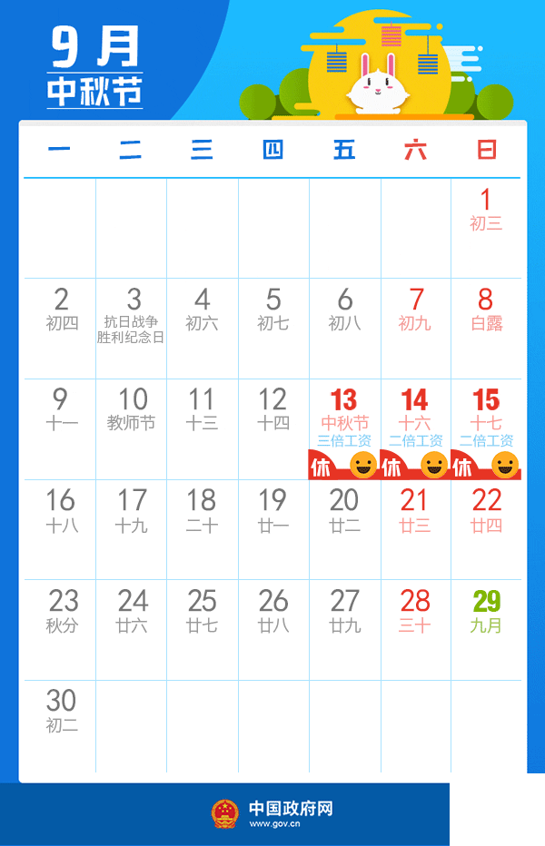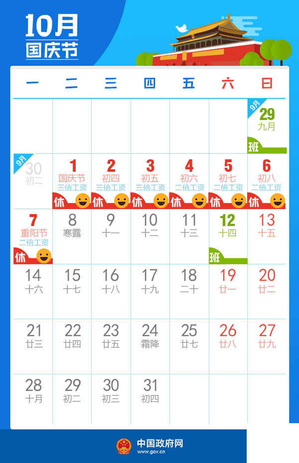 七、国庆节:10月1日至7日放假调休,共7天。9月29日(星期日)、10月12日(星期六)上班。