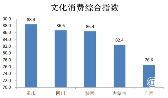 中国西部文化消费指数(2018)结果显示,重庆市位列第一,第二名到第五名依次是四川、陕西、内蒙古、广西。总体来看,西部地区文化消费综合指数低于全国平均水平。从分指标来看,西部地区文化消费意愿和文化消费水平两个分指数与全国平均水平相差较大,而文化消费环境、文化消费能力和文化消费满意度比全国平均水平低3%左右。