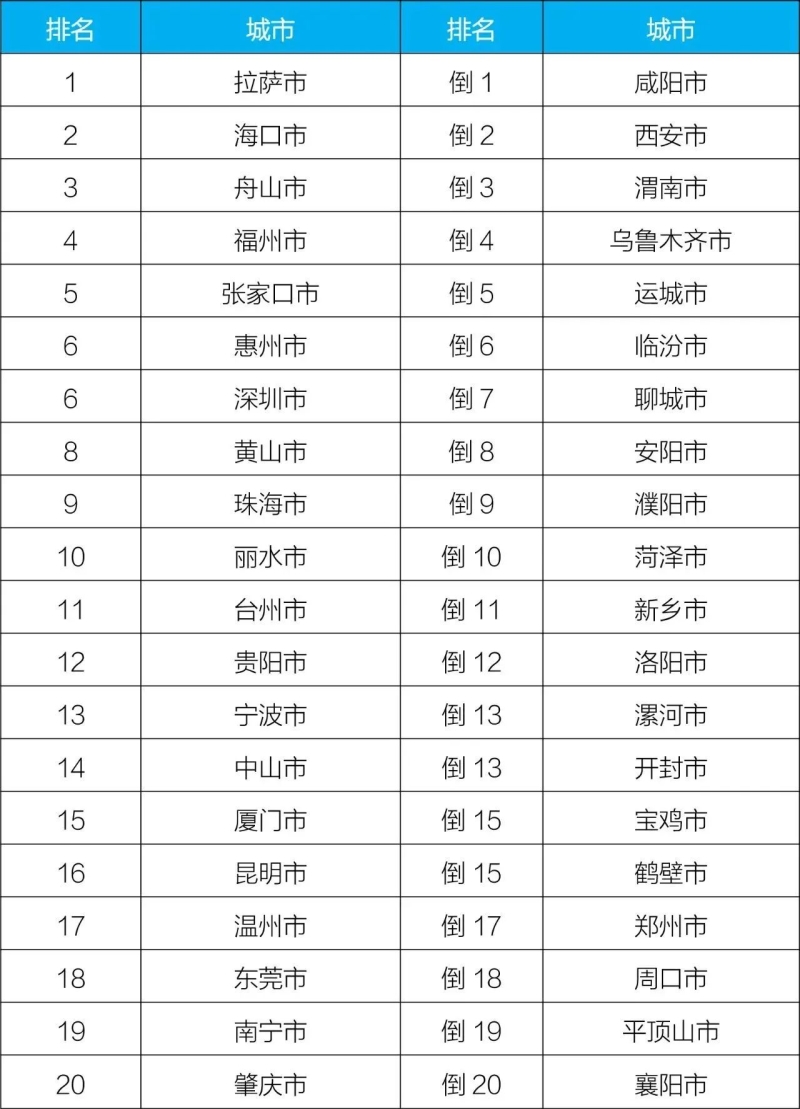 3月,168个重点城市中,拉萨、海口和张家口市等20个城市空气质量相对较好(从第1名至并列第19名);唐山、天津和保定市等20个城市空气质量相对较差(从倒数第1名至倒数第20名)。见附表1。