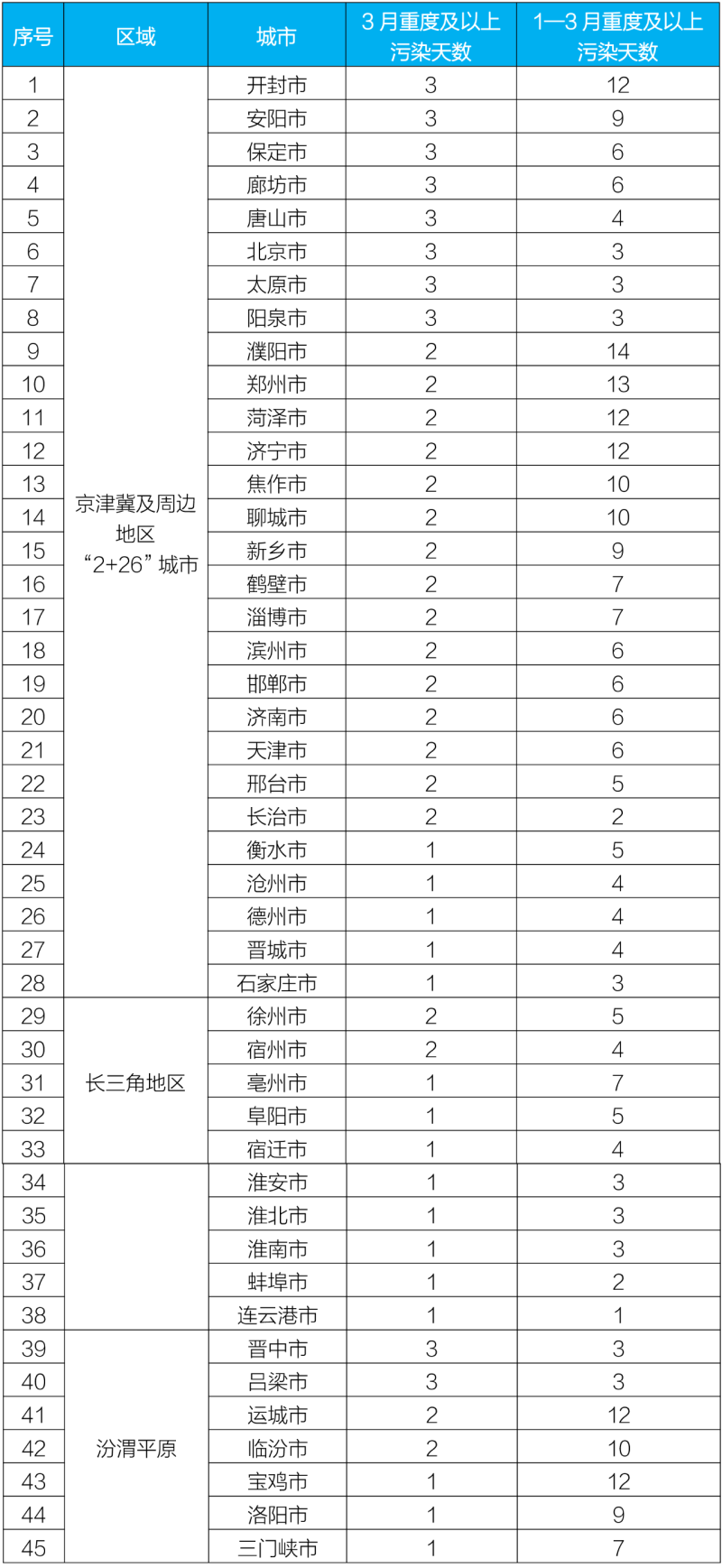 3月和1—3月重点区域出现重度及以上污染天的城市及具体天数详见附表4。