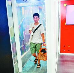 浙江杭州,一名顾客在由阿里开发的无人零售店内购买完商品后通过“支付门”完成结算。王伟伟摄 光明图片/视觉中国
