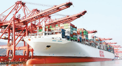 2018年10月12日,在江苏连云港港外贸集装箱码头,货轮在装卸进出口集装箱。王春 摄(人民视觉)