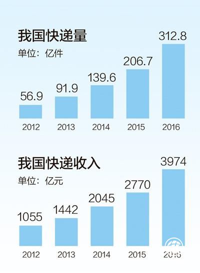 今年第二季度开始,我国常态化进入单日快递亿件时代!从2012年的不到57亿件,到2016年的312.8亿件,党的十八大以来,我国快递业务量连续5年保持了平均50%以上的增速,市场规模自2014年开始稳居世界第一。5年来,中国快递“火”起来,成为经济发展的一抹“亮色”。