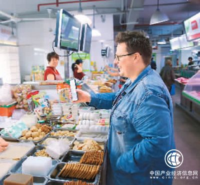 6月22日,德国人托马斯在上海一家菜场买菜时使用手机支付费用。 新华社记者 丁汀 摄