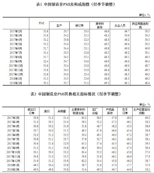 2018年2月份,中国制造业采购经理指数(PMI)为50.3%,比上月回落1.0个百分点,制造业总体延续扩张态势,增速有所放缓。