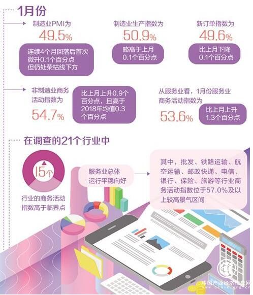 1月31日,国家统计局服务业调查中心和中国物流与采购联合会发布了中国采购经理指数。1月份,制造业PMI为49.5%,比上月微升0.1个百分点;非制造业商务活动指数为54.7%,比上月上升0.9个百分点;综合PMI产出指数温和上涨,超过去年四季度高点。
