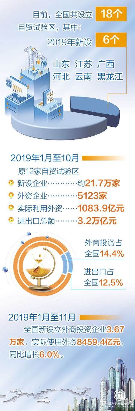 从2013年9月上海自贸试验区正式挂牌成立,到2019年底“1+3+7+1+6”18个自贸试验区全面铺开,覆盖东西南北中的自贸试验区建设正推动我国扩大开放不断深入。刚刚过去的2019年,新设山东、江苏等6个自贸试验区。商务部发布的数据显示,2019年1月至10月,仅原12家自贸试验区就新设企业约21.7万家、外资企业5123家;实际利用外资1083.9亿元,进出口总额3.2万亿元,以不到全国千分之四的国土面积,实现了占全国14.4%的外商投资和12.5%的进出口。