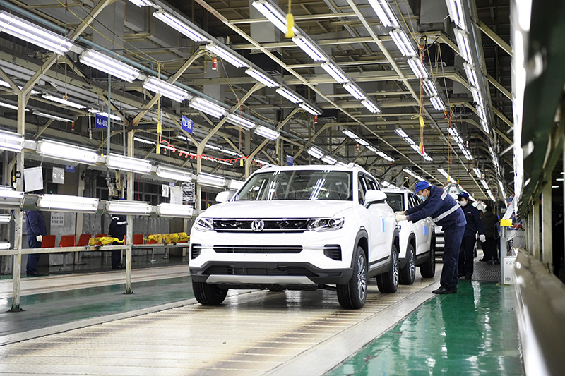 长安汽车渝北工厂车间内SUV汽车即将驶下生产线(2月18日摄)。新华社记者 唐奕 摄