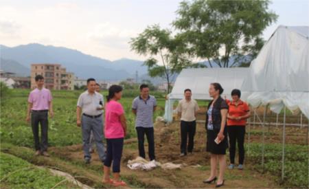右二为连平县扶贫办主任许建花等领导小组到富乐村大棚蔬菜种植基地指导和调查贫困户的种植收成情况(摄影/黄青龙)
