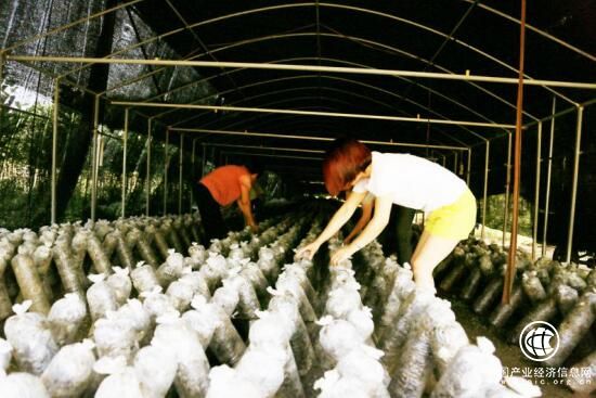 留山镇好汉村香菇种植基地里贫困群众在翻动袋料香菇