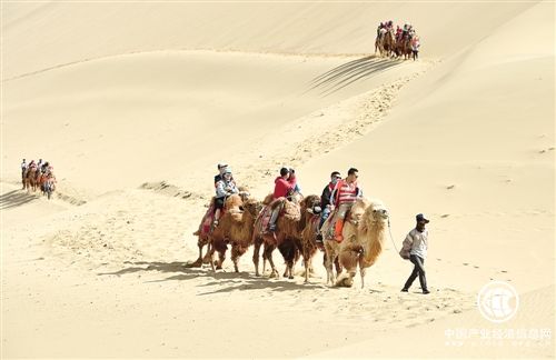 游客在甘肃敦煌鸣沙山骑骆驼。 新华社记者 范培珅摄