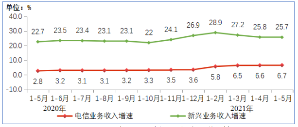 2020-2021年1-5月新兴业务收入增长情况