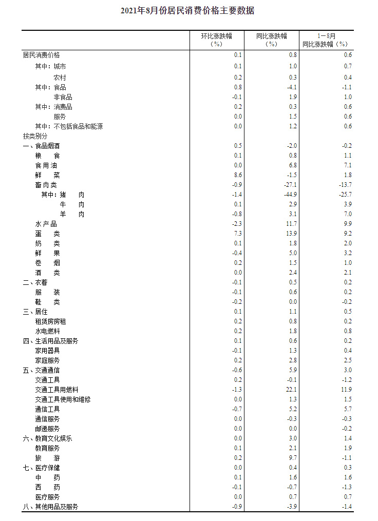 2021年8月份,全国居民消费价格同比上涨0.8%。其中,城市上涨1.0%,农村上涨0.3%;食品价格下降4.1%,非食品价格上涨1.9%;消费品价格上涨0.3%,服务价格上涨1.5%。1--—8月平均,全国居民消费价格比去年同期上涨0.6%。