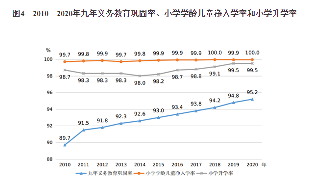 2.义务教育全面普及。《纲要》实施以来,九年义务教育改革不断深化,义务教育实现全面普及。义务教育均衡发展持续推进,义务教育质量进一步提高。2020年,全国九年义务教育巩固率为95.2%(见图4),比2010年提高4.1个百分点,实现《纲要》“达到95%”的目标。2010年以来,小学学龄儿童净入学率保持在99.7%以上,小学升学率保持在98%以上。2020年,全国共有义务教育阶段学校21.1万所;专任教师1029.5万人,比2010年增长12.6%;在校生1.56亿人,比2010年增长2.8%。2020年,义务教育阶段在校生中进城务工人员随迁子女1429.7万人,占在校生比重为9.1%,比2010年提高1.5个百分点。