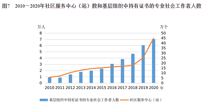 2.儿童社会环境不断优化。《纲要》实施以来,城乡社区服务体系建设大力推进,依托城乡社区设立的儿童之家成为守护儿童健康成长的“第二家”。截至2020年底,全国共有社区服务中心(站)44.8万个(见图7),是2010年的7.9倍;共有儿童之家(或儿童中心)32.1万个[7],是2012年[8]的6.7倍;基层组织中持有证书的专业社会工作者7.1万人,是2010年的7.8倍。