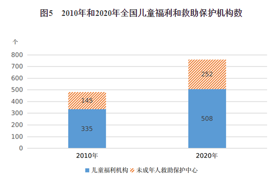 1.儿童福利和救助保护机构建设稳步推进。《纲要》实施以来,儿童福利机构和未成年人救助保护机构建设不断加强,机构数量稳中有升,为开展儿童福利保护服务提供了有力保障。截至2020年底,全国共有儿童福利和救助保护机构760个(见图5),比2010年底增加280个;机构共有床位10.1万张,比2010年底增加4.5万张。其中,儿童福利机构508个,床位9.1万张;未成年人救助保护中心252个,床位1.0万张。2020年,全年共救助流浪未成年人3.1万人次。