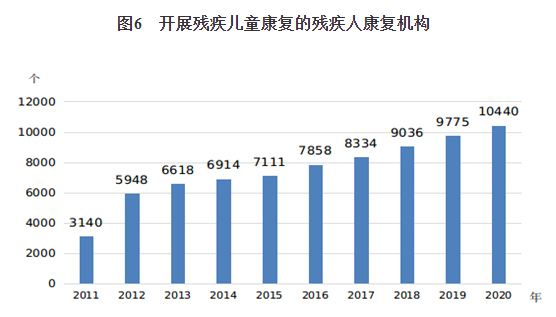 3.残疾儿童康复服务水平显著提升。《纲要》实施以来,国家先后实施残疾儿童抢救性康复项目、残疾儿童康复救助制度,目前全国残疾儿童康复救助政策体系、工作体系和服务网络全面建立,为开展残疾儿童康复救助提供了有力保障。截至2020年底,全国开展残疾儿童康复的残疾人康复机构10440个(见图6),比2011年增加7300个。2020年,全国共有23.7万名0—6岁残疾儿童接受了基本康复服务,比2016年[6]增加8.7万人,接受基本康复服务的残疾人中0—6岁残疾儿童比重为2.2%。