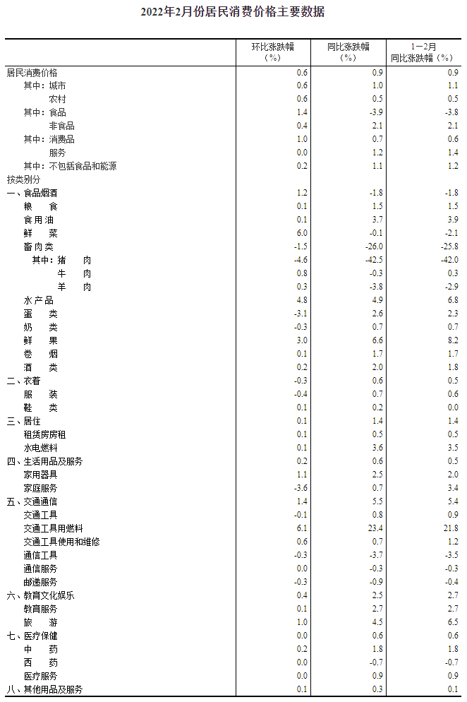2022年2月份,全国居民消费价格同比上涨0.9%。其中,城市上涨1.0%,农村上涨0.5%;食品价格下降3.9%,非食品价格上涨2.1%;消费品价格上涨0.7%,服务价格上涨1.2%。1—2月平均,全国居民消费价格比上年同期上涨0.9%。
