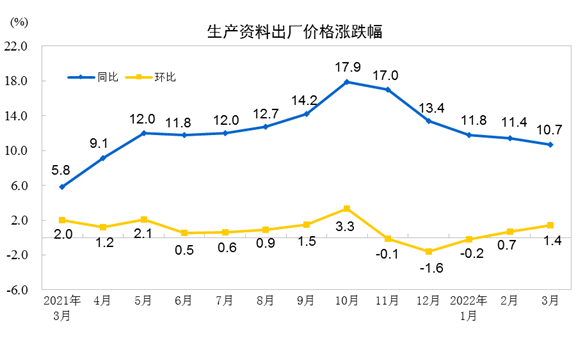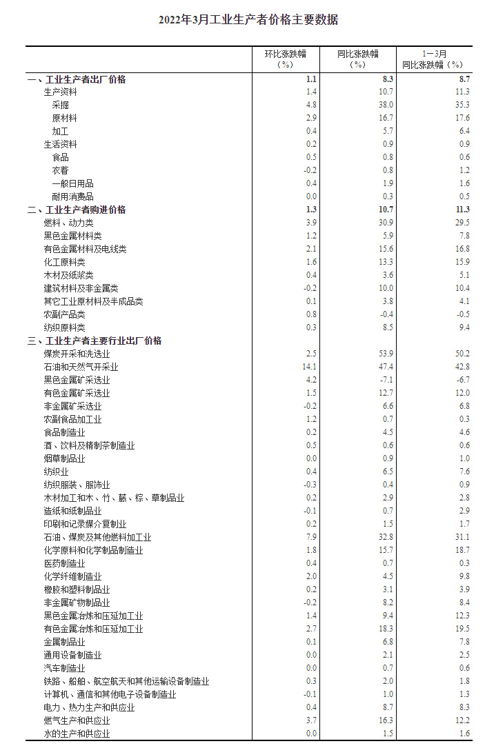 2022年3月份,全国工业生产者出厂价格同比上涨8.3%,环比上涨1.1%;工业生产者购进价格同比上涨10.7%,环比上涨1.3%。一季度,工业生产者出厂价格比去年同期上涨8.7%,工业生产者购进价格上涨11.3%。