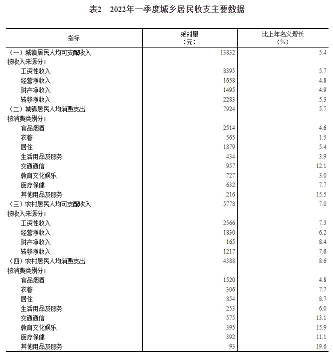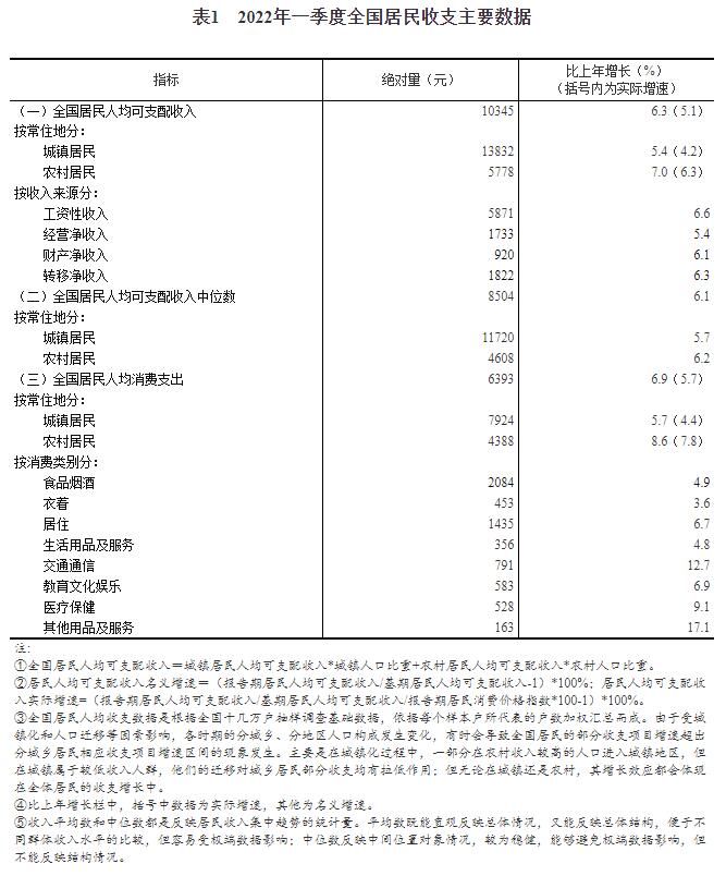 一季度,全国居民人均可支配收入10345元,比上年名义增长6.3%,扣除价格因素,实际增长5.1%。分城乡看,城镇居民人均可支配收入13832元,增长(以下如无特别说明,均为同比名义增长)5.4%,扣除价格因素,实际增长4.2%;农村居民人均可支配收入5778元,增长7.0%,扣除价格因素,实际增长6.3%。