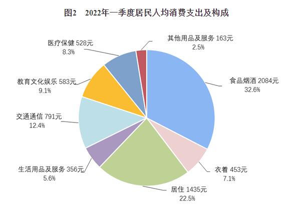 一季度,全国居民人均食品烟酒消费支出2084元,增长4.9%,占人均消费支出的比重为32.6%;人均衣着消费支出453元,增长3.6%,占人均消费支出的比重为7.1%;人均居住消费支出1435元,增长6.7%,占人均消费支出的比重为22.5%;人均生活用品及服务消费支出356元,增长4.8%,占人均消费支出的比重为5.6%;人均交通通信消费支出791元,增长12.7%,占人均消费支出的比重为12.4%;人均教育文化娱乐消费支出583元,增长6.9%,占人均消费支出的比重为9.1%;人均医疗保健消费支出528元,增长9.1%,占人均消费支出的比重为8.3%;人均其他用品及服务消费支出163元,增长17.1%,占人均消费支出的比重为2.5%。