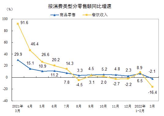 按消费类型分,一季度商品零售98006亿元,同比增长3.6%;餐饮收入10653亿元,增长0.5%。3月份,商品零售31298亿元,同比下降2.1%;餐饮收入2935亿元,下降16.4%。