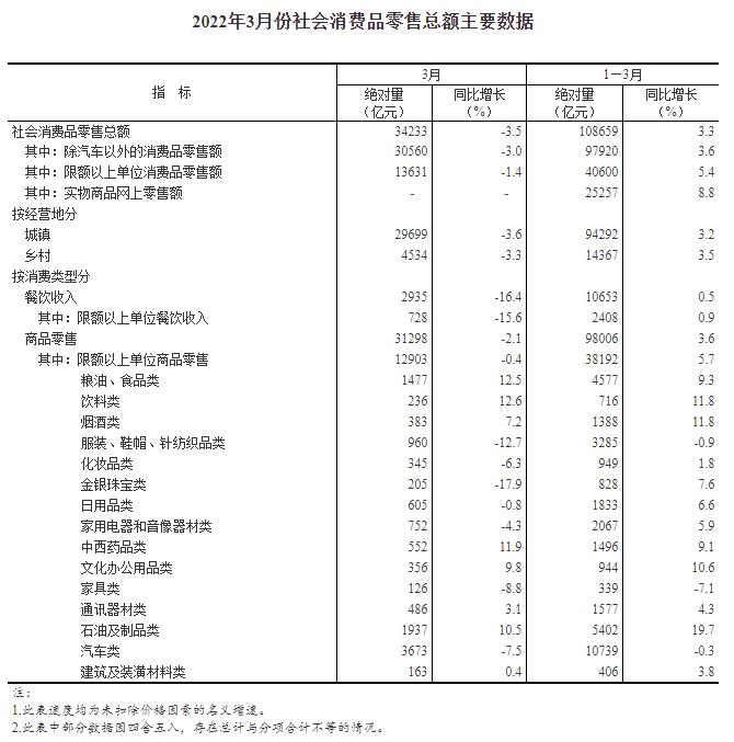 3月份,社会消费品零售总额34233亿元,同比下降3.5%。其中,除汽车以外的消费品零售额30560亿元,下降3.0%。